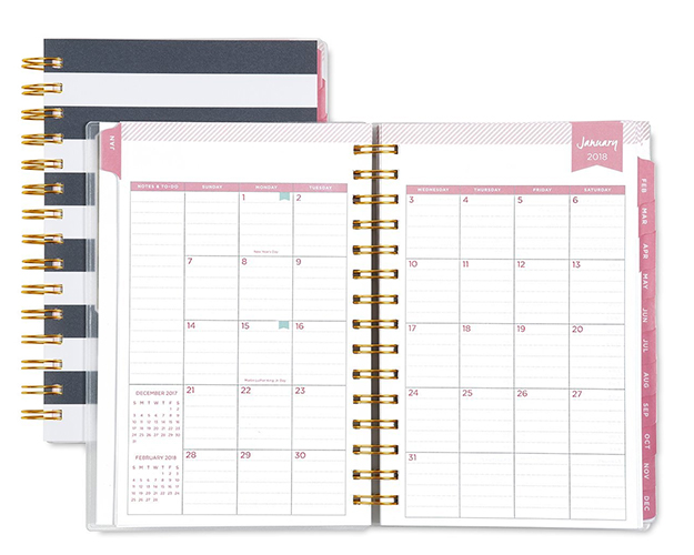 You can use a free on-line one like Google Calendar or purchase a pretty calendar like this navy and white striped Day Designer for 2018.