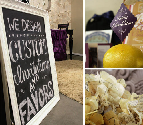 Signage. You’ve got seconds to tell a passerby who you are and what you do. Make sure it’s crystal clear. Mekala used a framed chalkboard sign (near walkway) with a handwritten note – telling passersby “We design custom invitations and favors”. Why leave it up to guesswork?!