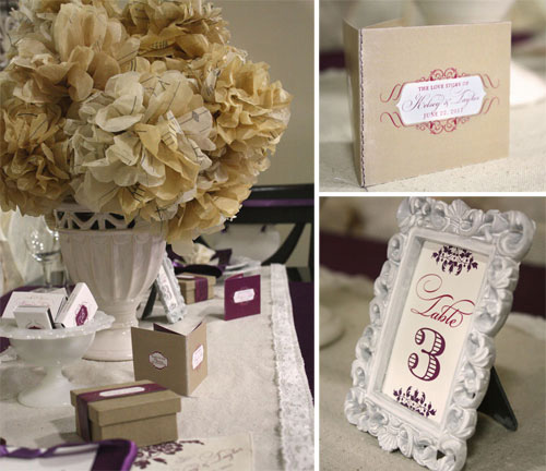 Visual Image. Customized match boxes, wine, wedding photo book (all custom products Mekala offers her clients), crystal chandeliers, flowers made from vintage paper sewing patterns and the beautiful ruffled table runner work together to ‘convey a unique wedding love story’.