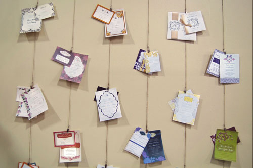 Display your Goods and Services in a fun/unique way. I LOVE how actual past client invitations were hung to string and displayed as wall art. Not only is this a cool PORTFOLIO idea showcasing Mekala’s talented work, but a large number of customers she has served = instant credibility.
