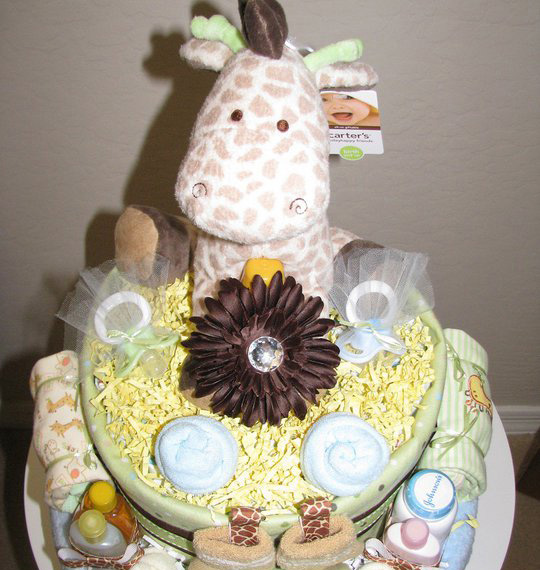 - A gift basket stuffed with baby items (like the Giraffe Theme Diaper Baby Basket by Daily Walk Gifts and Diaper Cakes below)