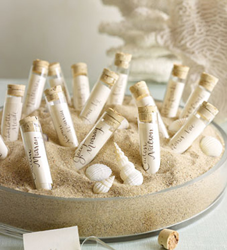FYI: I found this inspirational idea (and photo) via Martha Stewart…she placed names on paper and slid them into the vials as seating cards for  a wedding… and automatically my mind went towards this business use!